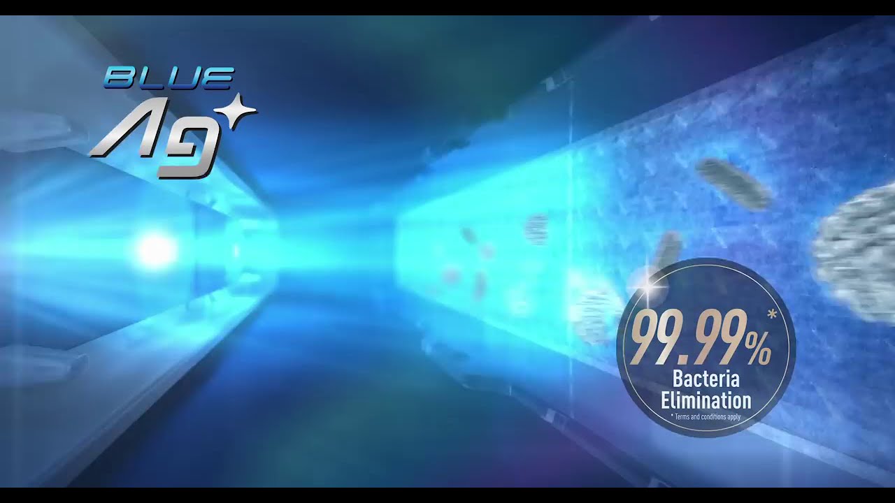 Công nghệ diệt khuẩn Blue Ag+ sử dụng ánh sáng xanh từ đèn LED, kích hoạt bề mặt bạc trên lưới lọc Ag tạo ra các gốc tự do (OH). Các gốc OH sẽ bám dính vi khuẩn trong luồng khí tủ lạnh rồi tiêu diệt vi khuẩn tại lưới lọc. (Ag+) giúp diệt vi khuẩn gây hại lên đến 99.99%*, hạn chế lây mùi cho thực phẩm, giữ thực phẩm tươi ngon trọn dinh dưỡng. Đồng thời không khí trong tủ luôn được giữ sạch sẽ và an toàn, đảm bảo vệ sinh an toàn thực phẩm, góp phần bảo vệ sức khỏe của cả gia đình.