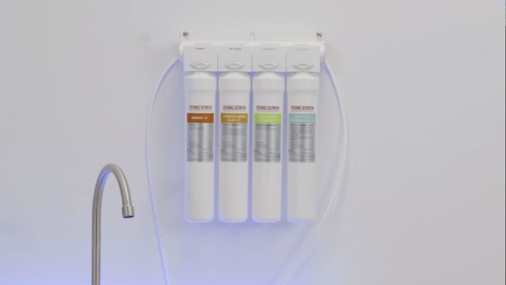 Nhằm đáp ứng hết mức tiêu chí tiết kiệm không gian, các lõi lọc này cũng được thiết kế khác biệt một chút. Cả 4 lõi đều có thể di chuyển lên xuống tùy biến. Đặt trường hợp tủ nhà bạn không còn nhiều diện tích thì bạn có thể nâng các lõi lọc lên không trung và xếp gọn đồ đạc bên dưới. Khi nào cần thay lõi thì mới cần hạ xuống để tháo ra.