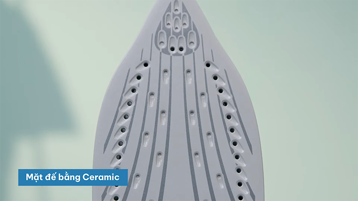 Mặt đế của bàn ủi được làm bằng sứ Ceramic chống dính, giúp việc là quần áo được trơn tru, phân bố nhiệt và hơi nước đều hơn. Ngoài ra chất liệu mặt đế này cũng chống trầy xước và dễ lau chùi. Bình nước trong thân bàn ủi có dung tích 300ml, một dung tích khá lớn, giúp bạn không cần châm nước nhiều lần trong lúc ủi.