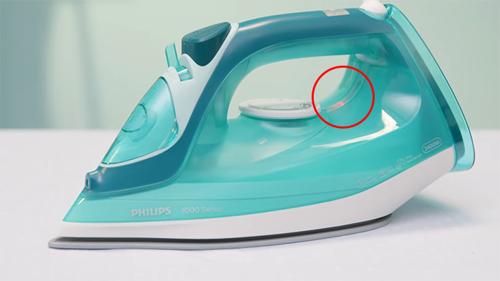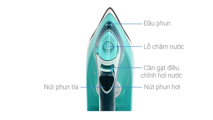 Bố trí ở phần mũi của bàn ủi là đầu phun tia nước và cửa đổ nước. Tiếp theo là cần gạt điều chỉnh hơi nước và nút bấm để phun nước, nằm ở vị trí thuận tiện nhất cho ngón tay các bạn bấm giữ khi cầm bàn ủi.