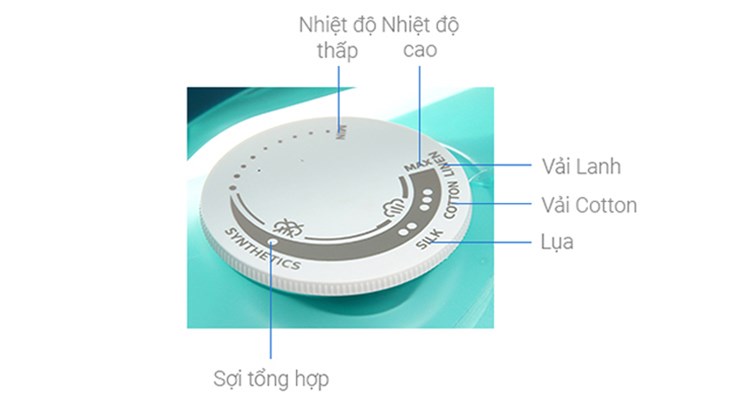 Bảng điều khiển xoay trên thân máy giúp bạn điều chỉnh nhiệt độ sao cho phù hợp với từng loại vải. Máy có cài đặt sẵn các nấc nhiệt phù hợp với bốn loại vải: vải tổng hợp, lụa, cotton và lanh.