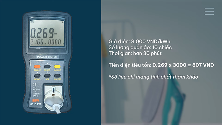 Dù có công suất mạnh mẽ nhưng chiếc bàn ủi này lại không tốn điện chút nào. Số đo thực tế bằng máy cho thấy để ủi 10 chiếc quần áo trong vòng hơn 30 phút thì bàn ủi tiêu tốn 0.269kWh, tương đương với 800 đồng (tạm tính). Một con số quá nhỏ để có được những bộ quần áo phẳng phiu, lịch sự.