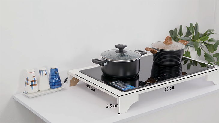 Bếp có kích thước khá gọn, với chiều dài mặt 73 cm và chiều sâu chỉ 43 cm. Do là bếp âm, mặt đá của tủ bếp cần được khoét hố theo kích thước lắp âm của bếp để lắp đặt. Còn nếu muốn lắp dương thì bạn sẽ cần chân đế thích hợp để sử dụng. Tuy nhiên bếp có một điểm cộng là dây nguồn có chiều dài tới 1 mét rưỡi, có thể vươn tới ổ cắm ở khá xa dưới gầm tủ bếp nên bạn không cần phải lo lắng nhiều về vị trí lắp đặt.