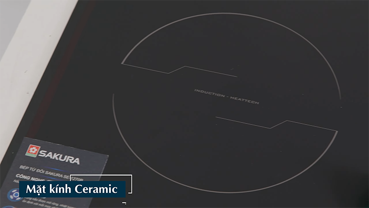 Mặt bếp được làm từ kính Ceramic cao cấp an toàn, chịu nhiệt tốt. Trên mặt bếp là hai vùng nấu có đường kính 21 cm, phù hợp với nhiều loại nồi, chảo.