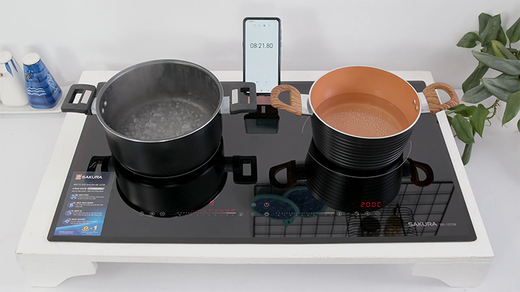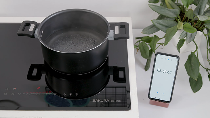 Trải nghiệm thực tế cho thấy khi sử dụng chức năng Booster, bếp từ đôi Sakura SE-1270B chỉ mất khoảng 4 phút để đun sôi khoảng nửa lít nước.