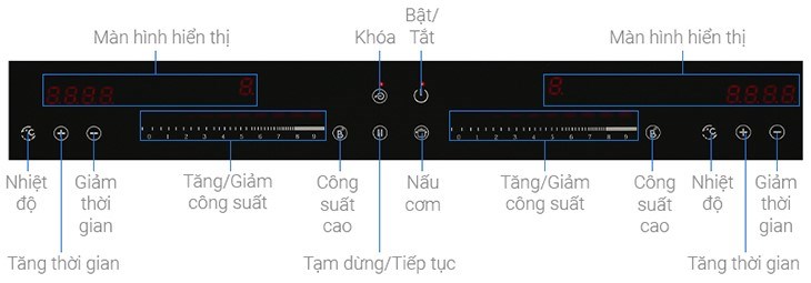 Dưới hai vùng nấu là bảng điều khiển cảm ứng. Mỗi vùng nấu có vùng điều khiển riêng đầy đủ chức năng, ở chính giữa là nút nguồn, nút khóa trẻ em và nút tạm dừng nấu.