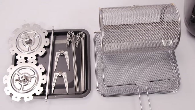Xét về phần phụ kiện sẽ có một đánh giá cao dành cho hãng Hafele khi trang bị cho mẫu nồi chiên không dầu AF-602A này nhiều phụ kiện đi kèm giúp người dùng chế biến được đa dạng món ăn có kết cấu khác nhau. Cụ thể các phụ kiện đi kèm sẽ bao gồm giỏ chiên, xiên nướng BBQ, xiên nướng gà có thể nướng gà nguyên con 1.2 kg, khay hứng dầu, tay cầm, giá lưới hỗ trợ bạn chuẩn bị các món ăn thêm thuận tiện, nhanh gọn.