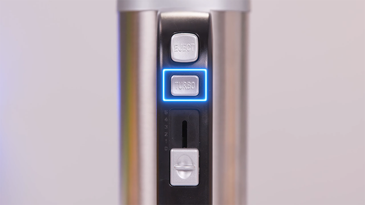 Trên tay cầm bằng nhựa cao cấp là nút EJECT - nhấn để tháo que đánh, nút chức năng TURBO tốc độ cao và nút trượt chỉnh tốc độ đánh. Những nút này đều được bố trí ở vị trí rất phù hợp: nút tháo que ở trên cùng, tiếp theo là Turbo và cuối cùng là nút chỉnh tốc độ. Điều này giúp bạn thao tác đổi tốc độ nhanh chóng và mượt mà, trên hết là tránh bấm nhầm nút tháo que trong lúc máy đang chạy.