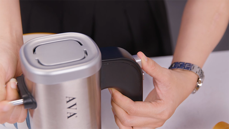 Máy đánh trứng AVA HM-167 có thân máy được làm bằng thép không gỉ đảm bảo vệ sinh an toàn thực phẩm. Phần thân máy rộng 8.5 cm, dài 19 cm và sâu 16 cm (tính cả quai), có thiết kế hình trụ đơn giản, dễ lau chùi.