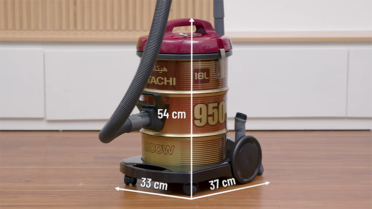 Tuy thuộc dòng máy hút bụi công nghiệp nhưng máy hút bụi Hitachi CV-950F WR có kích cỡ khá gọn nhẹ so với các máy khác cùng dòng, cao có 54 cm và rộng 37 cm.