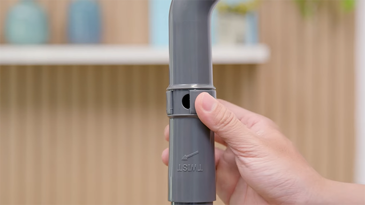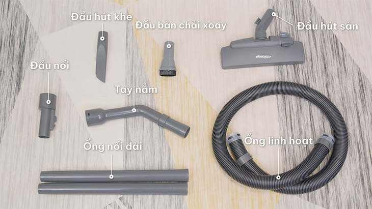 Máy có một đoạn ống hút mềm linh hoạt và hai đoạn ống nối cứng, có thể tháo lắp để thay đổi chiều dài của ống hút tùy với nhu cầu sử dụng. Trên tay nắm có khe hở có thể nới rộng bằng vòng xoay, dùng để điều chỉnh, dàn đều lực hút của máy khi hút những chất liệu không chịu được lực như rèm, thảm…