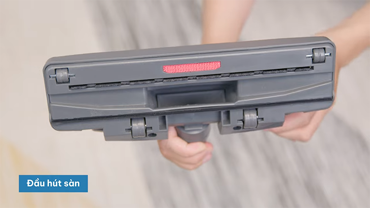 Đầu hút sàn đi kèm với máy còn có khả năng chuyển đổi giữa việc hút sàn và hút thảm nhờ một hàng chổi có thể thu gọn bằng công tắc ở mặt trên đầu hút.
