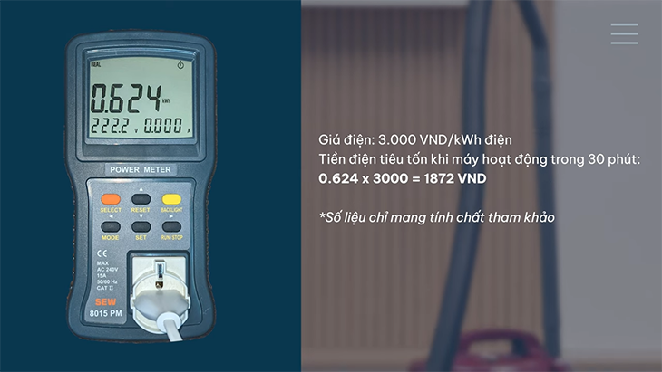 Ngoài tiếng ồn, người dùng máy hút bụi cũng rất quan tâm đến tiền điện mỗi tháng khi sử dụng máy. Kết quả đo đạc khi máy hoạt động trong 30 phút cho thấy máy tiêu tốn 0.624 kWh, tương đương với khoảng 1800 đồng. Trên thực tế, mỗi lần hút bụi trung bình cũng chỉ kéo dài khoảng 45 phút, và với mức tiêu thụ điện năng này thì bạn có thể an tâm sử dụng máy hút bụi Hitachi CV-950F WR mà không sợ tốn nhiều tiền điện.