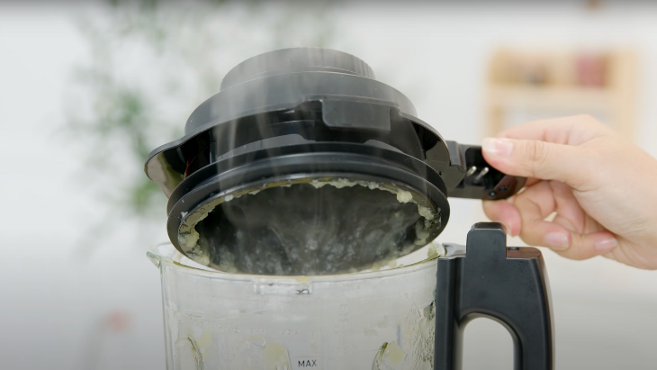 Mặc dù trên nắp cối có trang bị một miệng nhỏ để có thể cho thêm nguyên liệu trong lúc nấu, tuy nhiên, với các món nóng thì các bạn nên hạn chế cho vào giữa chừng vì rất dễ gây bỏng từ hơi nóng tỏa ra và cũng từ nguyên liệu trong cối xay bắn lên.