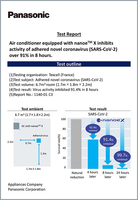 Đặc biệt, công nghệ Nanoe-X có khả năng ức chế hiệu quả virus Corona chủng mới (SARS-CoV-2) bám trên bề mặt đến 91% trong vòng 8 tiếng. Đây là kết quả thử nghiệm của Tổ chức nghiên cứu theo hợp đồng toàn cầu Texcell đã xác nhận.