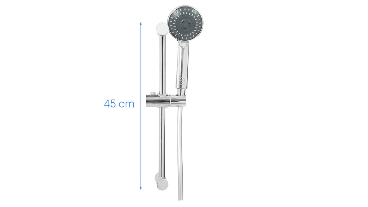 Máy đi kèm với vòi sen mạ crom sáng bóng. Vòi có 5 chế độ phun để phục vụ cho nhiều nhu cầu sử dụng khác nhau. Giá đỡ vòi có khả năng thay đổi chiều cao và độ nghiêng để phù hợp với nhiều chiều cao lẫn sở thích tắm đa dạng hơn.