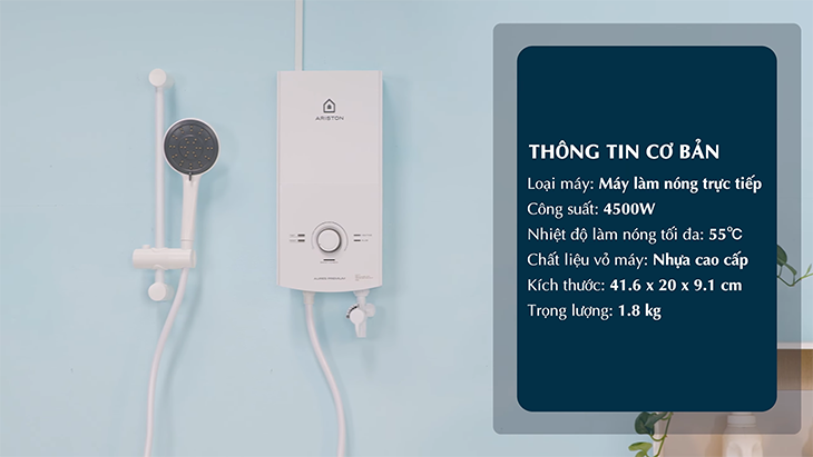 Máy nước nóng trực tiếp Ariston AURES PREMIUM 4.5 có công suất 4500W, cung cấp nước nóng có nhiệt độ tối đa là 55 độ C. Nhiệt độ nước này vô cùng an toàn, đảm bảo không gây bỏng với người già và trẻ nhỏ, nhưng có phần thích hợp hơn với vùng khí hậu không quá lạnh hoặc những nơi có nền nhiệt trên 20 độ C.