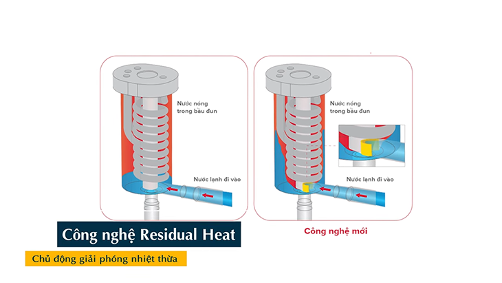 Trong quá trình sử dụng máy nước nóng, chắc hẳn các bạn đều đã gặp tình trạng vừa mở vòi mà lại nhận được nước nóng vô cùng, đến mức gây bỏng. Đó là một khuyết điểm của các máy nước nóng đời trước, do nước còn sót lại trong bầu đun vẫn nóng mà lại bị đun tiếp lần nữa khi máy được bật lên. Để khắc phục tình trạng ấy, nhà sản xuất Ariston đã trang bị cho máy nước nóng trực tiếp Ariston AURES PREMIUM 4.5 công nghệ Residual Heat. Công nghệ mới này tạo ra luồng nước xoáy khi bật máy, giúp nước lạnh mới dẫn vào bầu đun hòa tan nhanh với nước nóng cũ bên trong, nên nước ra vòi sẽ không bị quá nóng đến độ gây bỏng.