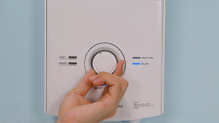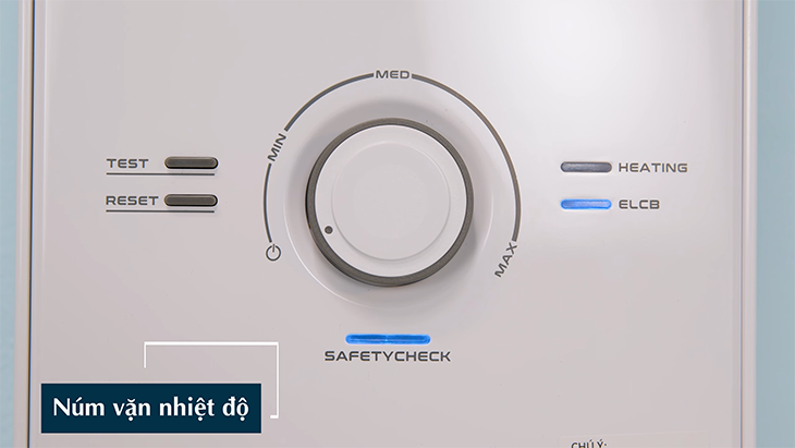 Còn ở chính giữa là đèn báo an toàn Safety Check và nút xoay điều chỉnh nhiệt độ vô cấp, tức là nhiệt độ của nước không bị giới hạn theo nấc 1, 2, 3… mà đôi khi là cách nhau rất xa về độ nóng như các dòng máy đời cũ khác. Khi sử dụng chiếc máy nước nóng này, bạn có thể thoải mái tùy chỉnh nhiệt độ theo nhu cầu cá nhân, tăng một chút, giảm một chút thôi cũng được.
