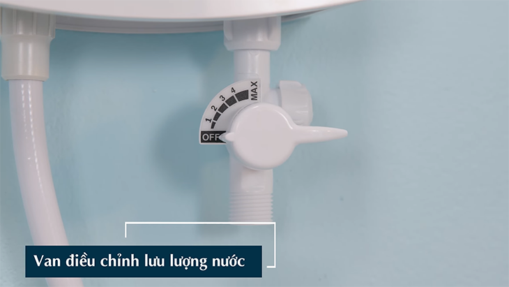 Từ vị trí nút xoay đi xuống, bạn sẽ tìm thấy đường nước ra để gắn vòi sen ở bên trái. Còn bên phải là đường nước vào gắn van điều chỉnh lưu lượng nước, giúp kiểm soát và điều chỉnh lượng nước vào máy.