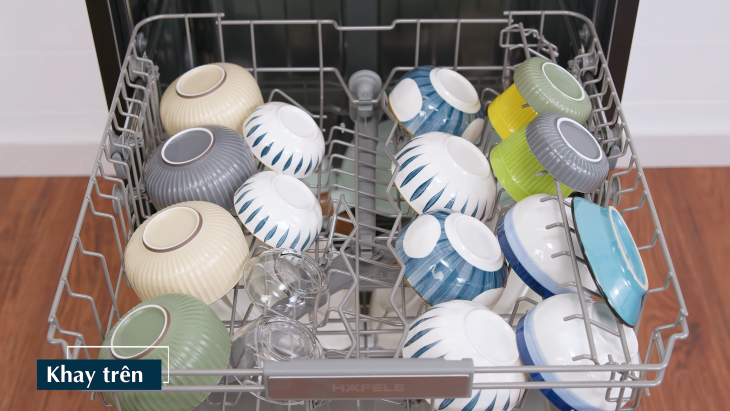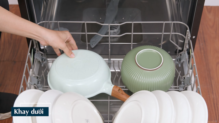 Đầu tiên là khay dưới cùng, cũng là khay lớn nhất, nơi chuyên dành để xếp các loại nồi/chảo/tô/dĩa/bình có kích cỡ lớn hoặc các đồ dùng bị bám bẩn nhiều. Ngoài ra bạn còn có thể tùy chỉnh để sắp xếp thêm được các vung hay nắp nồi. Chỉ có lưu ý là đừng sắp xếp đồ cần rửa quá cao ở khay này để tránh làm cản trở hoạt động của cánh quạt phun nước.