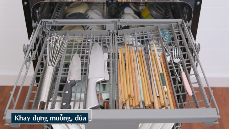 Và khay trên cùng là chỗ để dao, nĩa, muỗng, đũa và các dụng cụ nhỏ. Cũng khá là tiện lợi so với các loại máy rửa chén chỉ có 2 khay chính và 1 giỏ đựng đũa muỗng.