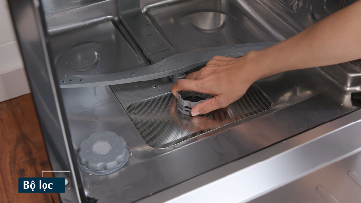 Các mảng thức ăn, nước xốt khi bị đánh bật sẽ rơi xuống bên dưới và được giữ lại tại bộ lọc cặn và bạn có thể tháo ra để đem chúng đổ đi sau mỗi lần rửa.Bộ lọc cặn, thức ăn thừa