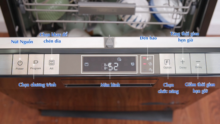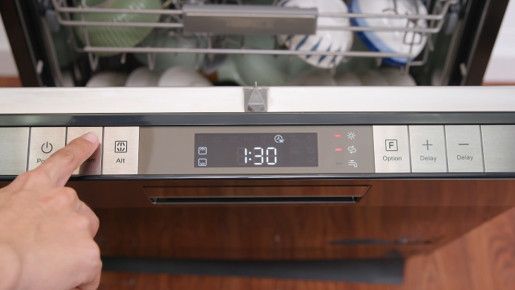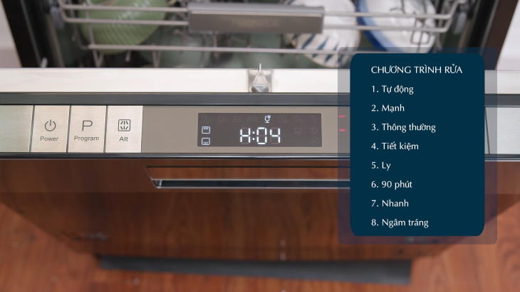 Trong số các chương trình rửa được liệt kê ở hình trên, đáng chú ý có chương trình rửa "Nhanh" và "Ngâm tráng". Cụ thể, nếu như "Nhanh" phù hợp với độ bấm bẩn trên chén dĩa ít do máy tự động lược bớt công đoạn sấy để tiết kiệm thời gian thì "Ngâm tráng" được sử dụng chủ yếu cho trường hợp lượng chén dĩa không nhiều và bạn muốn rửa dồn lượng chén của 1-2 bữa lại để rửa một lần. Nó sẽ rửa sơ trong vòng 15 phút để tạm loại bỏ một ít cặn bẩn trước rồi sau đó bạn có thể hẹn giờ để vào chu trình rửa chính.