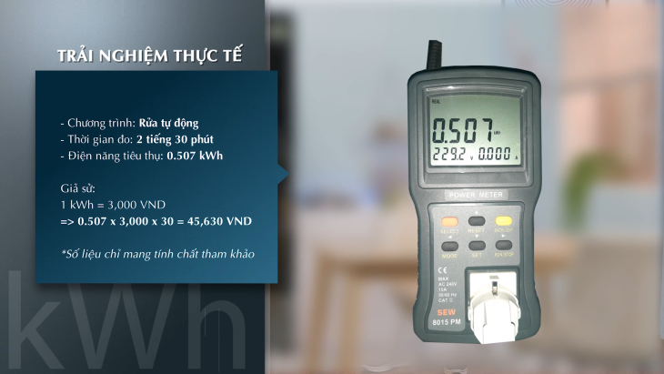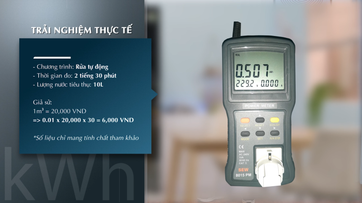 Sau quá trình trải nghiệm thì Điện máy Xanh có thu được các số liệu tiêu hao điện nước, được ghi lại bởi thiết bị đo chuyên dụng. Chi tiết hơn, với 1 lần sử dụng chương trình rửa tự động dài 2 tiếng 30 phút:
