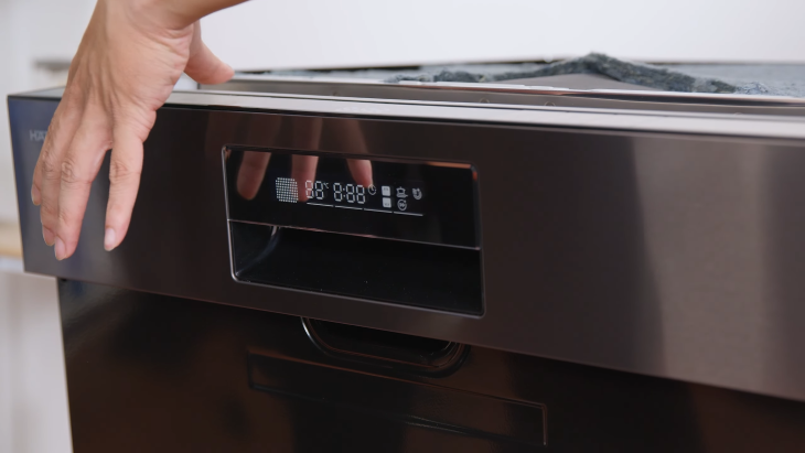 HDW-SI60AB còn được Hafele trang bị thêm 1 màn hình nhỏ, nằm trong tổng thể cụm bảng điều khiển nằm ở cạnh trên của cửa máy. Tại đây, bạn có thể thấy rõ một màn hình ở trung tâm và hai bên là các nút điều khiển dạng cảm ứng. Thay vì phải cúi, khom người xuống để điều chỉnh, bạn hoàn toàn có thể đứng thẳng mà vẫn thao tác được máy.
