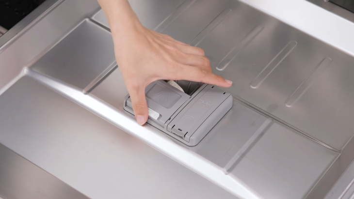 Tương tự nhiều loại máy rửa chén khác, mặt trong của cửa máy này cũng là nơi để đặt ngăn đựng viên rửa, chất tẩy rửa, chất làm bóng dùng cho việc rửa chén.