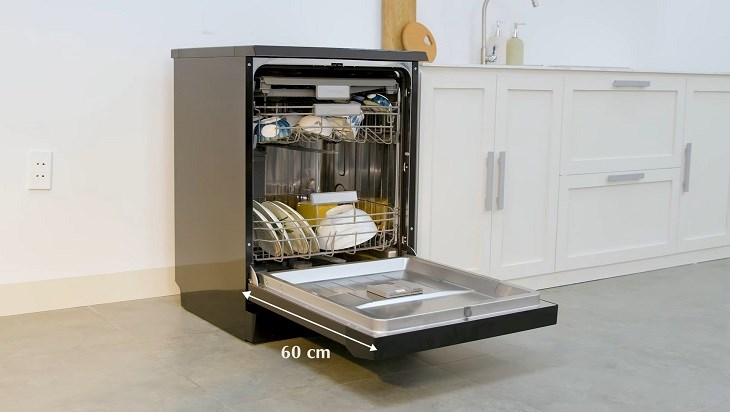 Cửa máy bằng thép không gỉ dày dặn, cách nhiệt rất tốt nên dù bên trong đang rửa chén bát bằng nước nóng thì bề mặt bên ngoài vẫn mát lạnh, không làm bạn bỏng khi chạm vào. Cánh cửa được thiết kế dạng mở dọc có thêm tác dụng hứng nước đọng từ các khay chén bát, giúp nước không nhỏ giọt ra làm bẩn sàn nhà. Cũng chính vì thế mà phần cửa mở tối đa sẽ hơi chiếm diện tích một chút, khoảng tầm 60 cm. Nếu nhà bạn có thiết kế đảo bếp hoặc sắp xếp bàn ghế trước máy thì nên lưu ý để không bị vướng khi mở cửa máy.