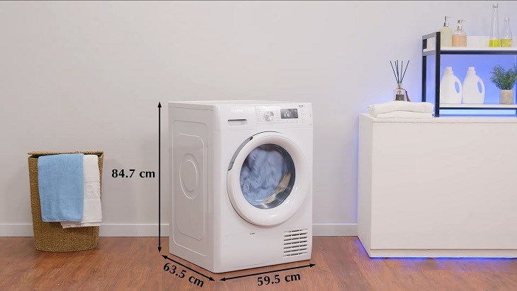 Máy sấy ngưng tụ Whirlpool FreshCare+ được sản xuất năm 2022 tại Ba Lan nên mang vẻ ngoài rất hiện đại, thiết kế kiểu lồng giặt ngang đậm chất châu Âu cùng với gam màu trắng tinh tế, kích thước chiều cao 84.7 cm, bề ngang 59.5 cm, chiều sâu 63.5 cm, khá gọn gàng nên có thể phối hợp với các món đồ nội thất khác, thích hợp xếp đặt trong nhiều không gian sống phong cách khác nhau. Các góc cạnh máy được bo cong tránh tình trạng va quệt, trầy xước trong quá trình sử dụng.