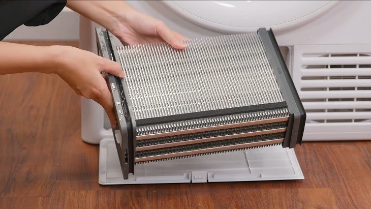 Hơi ẩm ngưng tụ trong bộ phận dưới thân máy rồi được bơm lên khoang chứa nước bên trên