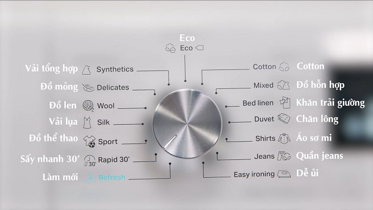 - Có 15 chương trình sấy phù hợp với từng loại chất liệu quần áo, chăn mền.