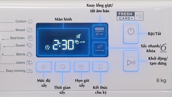 Bên cạnh màn hình hiển thị là các nút bấm tính năng khác như: chọn mức độ sấy, chỉnh thời gian sấy, hẹn giờ sấy, bật chuông báo sau khi kết thúc chương trình sấy, nút sấy nhanh/khóa trẻ em (cần giữ nút khoảng 3 giây để bật chức năng khóa trẻ em), nút freshcare để xoay lồng sau khi sấy giúp ngăn sự phát triển của vi khuẩn trên quần áo và tắt âm thanh.