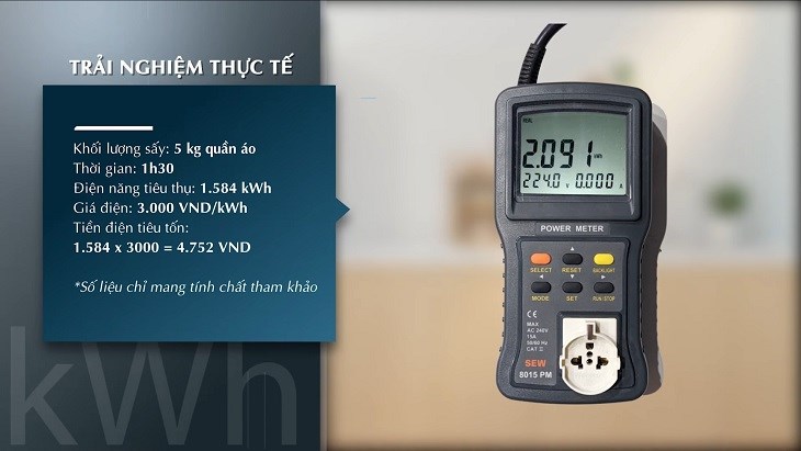 Trải nghiệm thực tế số lượng điện tiêu thụ với khối lượng 5 kg quần áo ướt trong khoảng thời gian 1h30 phút, các bạn có thể tham khảo ở hình dưới.
