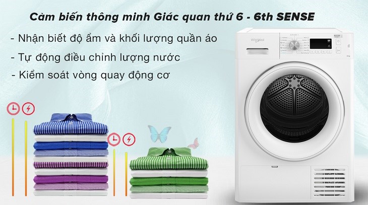 Ngoài các chương trình sấy đồ chi tiết đến từng dạng chất liệu và tính năng hẹn giờ, giặt hấp hiệu quả, tiện lợi, máy còn trang bị công nghệ cảm biến thông minh Giác quan thứ 6 - 6th SENSE có thể điều chỉnh nhiệt độ cùng thời gian sấy phù hợp với khối lượng và độ ẩm của đồ giặt, tự điều chỉnh lượng nước phù hợp, kiểm soát vòng quay động cơ. Nhờ đó nâng cao hiệu quả sấy đồ, cũng như giúp cho máy sấy dưới 8kg này tiết kiệm năng lượng khi vận hành. Quá trình sấy sẽ được rút ngắn lại, trang phục cũng giữ được chất lượng bền lâu.