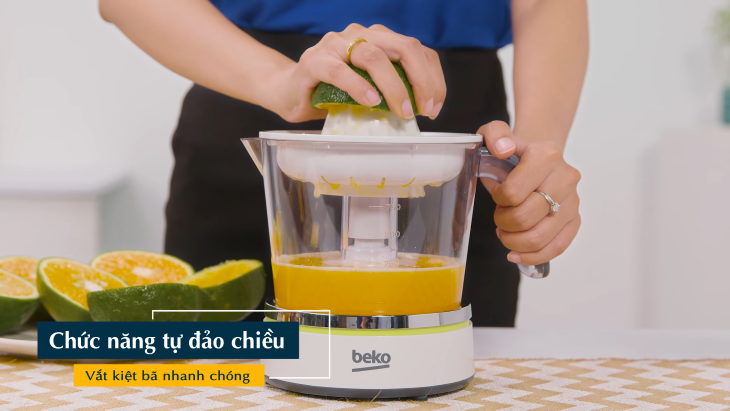 Máy còn có cả chức năng tự động đảo chiều trong khi vắt để vắt kiệt từng tép cam. Thêm vào đó, máy sẽ tự động ngắt điện khi quá nhiệt để đảm bảo an toàn khi sử dụng.