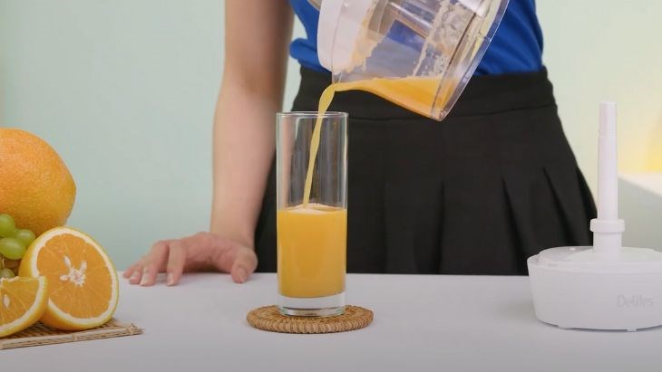 Thành phẩm mà chúng ta có được từ chiếc máy vắt cam Delites này là 1 ly cam vắt tươi mát, không bị lẫn hạt kể cả là hạt lép. Đặc biệt, các tép cam tươi mọng nước vẫn được giữ lại nhờ phần lưới lọc kết hợp với thanh ngang trên đầu vắt, giúp tép cam và hạt được lọc kỹ hơn khi vắt.