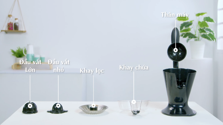 Còn lại dĩ nhiên không thể thiếu thân máy, khay chứa, lưới lọc, đầu vắt.