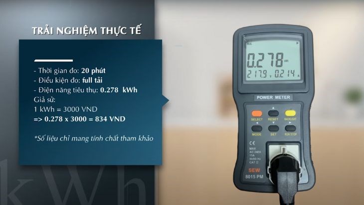 Thêm 1 yếu tố được rất nhiều người quan tâm đó là với công suất lớn như vậy thì sử dụng nồi chiên không dầu này có tốn điện hay không? Dưới đây là kết quả đo điện được Điện máy Xanh thực hiện bằng thiết bị chuyên dụng để bạn tham khảo.