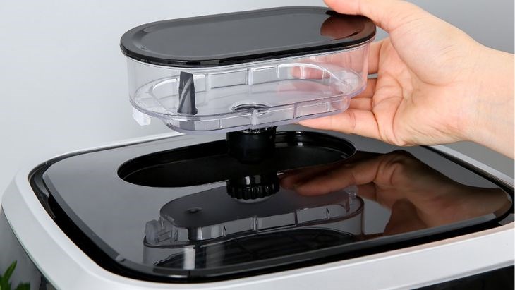 Lớp vỏ nhựa bên ngoài màu đen bóng có điểm nhấn là tay cầm và viền trên màu xám, tuy nhiên điểm nổi bật nhất có thể làm cho chúng ta chú ý lại là phần bình chứa nước ở phía trên nồi. Bình chứa này có thể tháo rời ra để hứng nước hoặc đem đi vệ sinh, khá tiện lợi. Chi tiết về cách sử dụng bộ phận này sẽ được đề cập ở phần sau của bài viết.