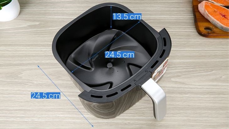 Nồi có thiết kế đơn giản với hình khối vuông, kèm những đường bo cong ở các góc để tổng thể hài hoà như những nồi chiên không dầu khác. Với số đo "3 vòng" ngang - cao - sâu lần lượt là 29.5 - 37 - 35.5 (cm), cùng dung tích gần 7 lít, nồi trông khá là gọn gàng và không chiếm nhiều không gian.