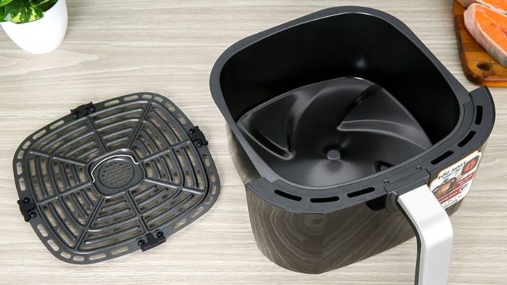 Bên dưới lòng nồi được thiết kế hình cánh quạt lõm xuống giúp không khí trong nồi được lưu thông tốt hơn, giúp thực phẩm chín đều. Đồng thời khi đặt khay tách dầu vào thì cũng có khoảng trống để không khí có thể len lỏi trong quá trình nấu nướng và lượng dầu mỡ thừa (nếu có) tiết ra khi nướng sẽ chảy xuống tách biệt với đồ ăn, giúp món ăn ráo dầu, giòn ngon.