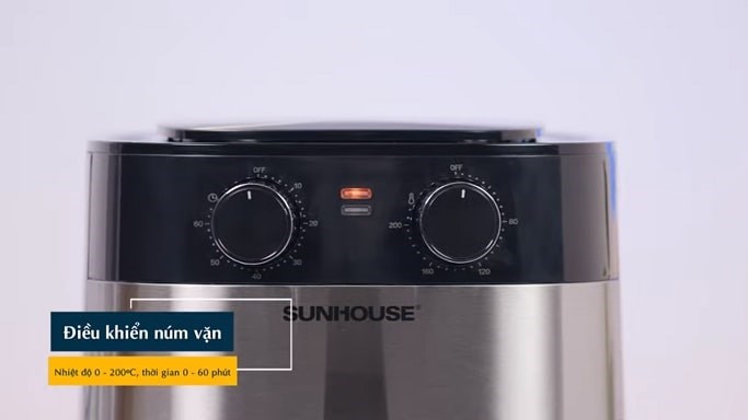 Mẫu nồi chiên này của Sunhouse sử dụng bảng điều khiển nút vặn, hay còn gọi là điều khiển cơ. Nó giúp bạn dễ dàng thiết lập mức nhiệt và thời gian hợp lý cho từng món ăn với nhiệt độ tối đa đến 200°C, hẹn giờ đến 60 phút. Giữa 2 nút vặn còn có đèn báo để theo dõi trạng thái hoạt động của nồi.