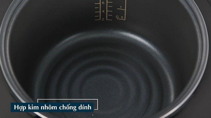 Lòng nồi làm bằng hợp kim nhôm dày dặn 2.116 mm truyền nhiệt rất tốt, nấu cơm chín đều với thời gian nhanh chóng, bề mặt lòng nồi phủ lớp chống dính giúp cơm không lo bị cháy, lại dễ dàng vệ sinh sạch sau khi sử dụng. Tuy nhiên theo thời gian lớp chống dính dưới lòng nồi dễ bị bong tróc trong quá trình sử dụng, vì thế bạn nên vệ sinh lòng nồi bằng mút rửa bát hoặc khăn mềm để lớp chống dính sử dụng được lâu hơn.