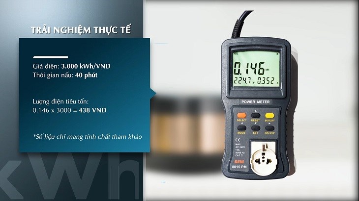 Ngoài ra, nồi còn giúp tiết kiệm tối đa điện năng tiêu thụ nhờ sử dụng công nghệ cảm ứng điện từ. Dưới đây bạn có thể tham khảo lượng điện năng tiêu thụ cho 2 lon gạo trong thời gian nấu khoảng 40 phút: