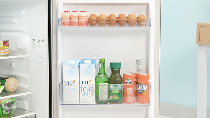 Cửa tủ ngăn mát cũng có ba ngăn đựng đồ. Ngăn trên cùng có khay để trứng tháo lắp được, để được tới 12 quả trứng. Ngăn tiếp theo cách ngăn đầu khá xa, đủ để bạn cất đồ uống dạng chai cao như chai sữa, chai rượu vang…