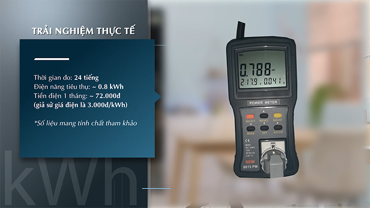 Ngoài ra, số liệu đo bằng máy trong 24 tiếng hoạt động cho thấy tủ chỉ tiêu thụ 0.8kWh, tương đương với 72.000 đồng tiền điện một tháng (tạm tính). Có thể nói đây là một chi phí khá rẻ cho việc trữ thực phẩm tươi ngon và có ngay đồ uống lạnh mỗi ngày.